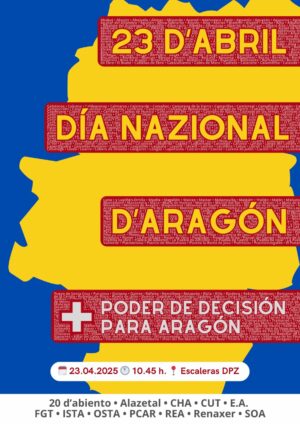 Este 23 de abril, día nacional de Aragón, las organizaciones aragonesistas abajo firmantes, queremos trasmitir al pueblo aragonés nuestro compromiso de luchar para lograr un mayor poder de decisión y con ello poder gestionar y decidir sobre nuestro futuro: