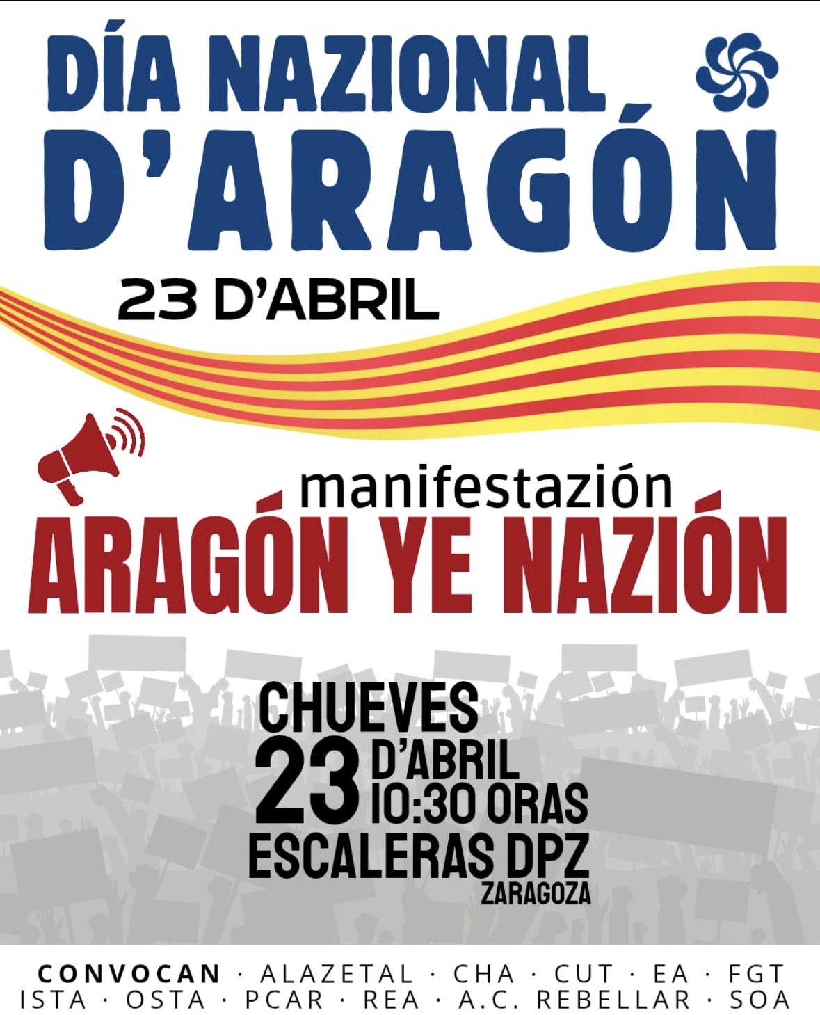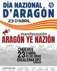 Este 23 de abril, DÍA NACIONAL DE ARAGÓN, las organizaciones aragonesistas abajo firmantes, queremos trasmitir a la ciudadanía aragonesa nuestro compromiso de luchar para lograr un mayor poder de decisión y con ello poder gestionar y decidir sobre nuestro futuro: